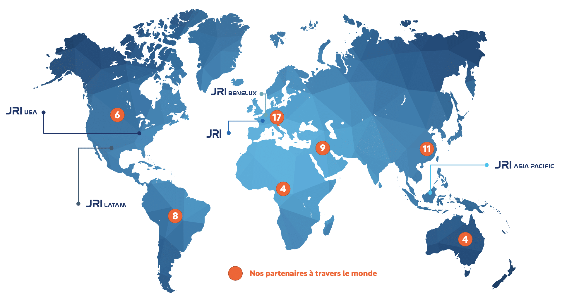 JRI développe une présence mondiale performante avec sa force de vente export basée au siège, en contact permanent avec ses bureaux en Amériques et Asie qui animent un vaste réseau de distributeurs qualifiés.