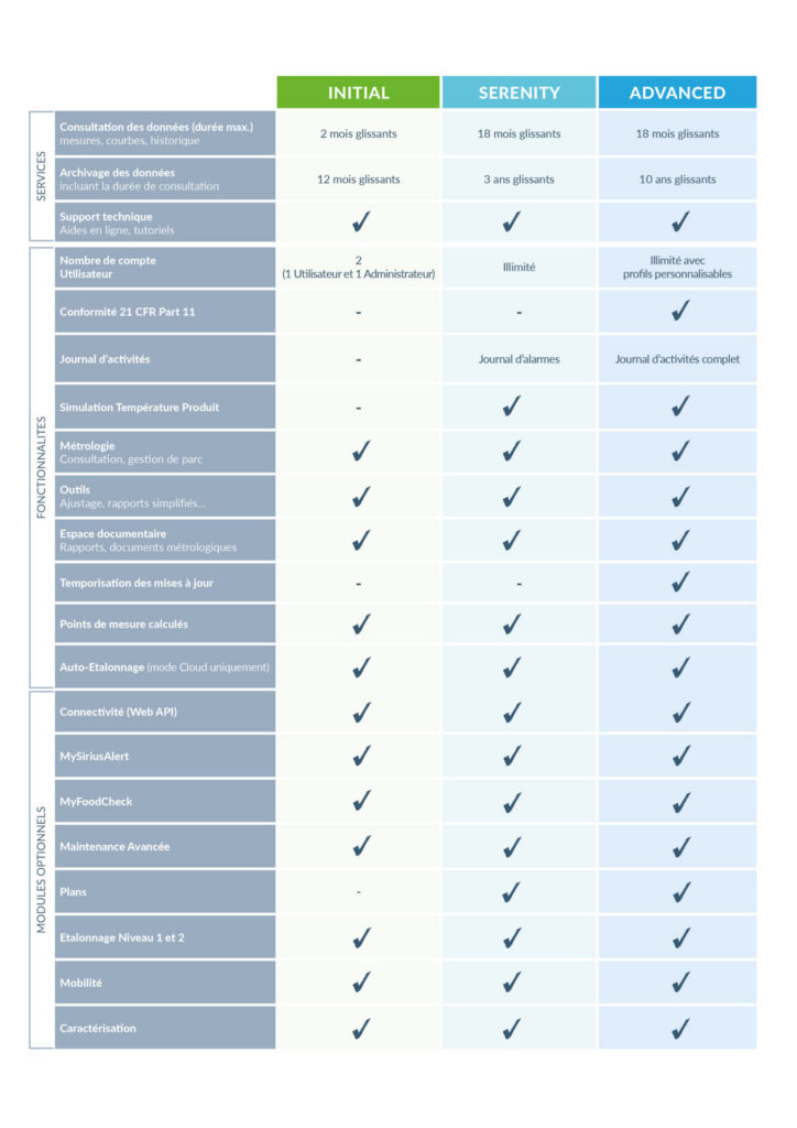 La plateforme JRI MySirius propose trois niveaux d’abonnements adaptés aux différents besoins des utilisateurs : Initial, Serenity et Advanced. Ces formules permettent d’exploiter vos mesures avec des fonctionnalités et des durées de stockage variables selon vos exigences opérationnelles